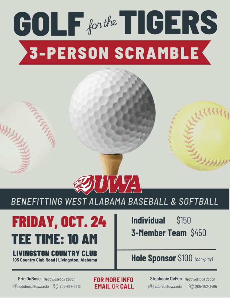 UWA Baseball and UWA Softball will host Golf for the Tigers 3-Person Scramble on Friday, Oct. 24, at Livingston Country Club. Tee Time is 10 a.m. Participants can register as an individual or register a 3-person team. Hole sponsorships are available.